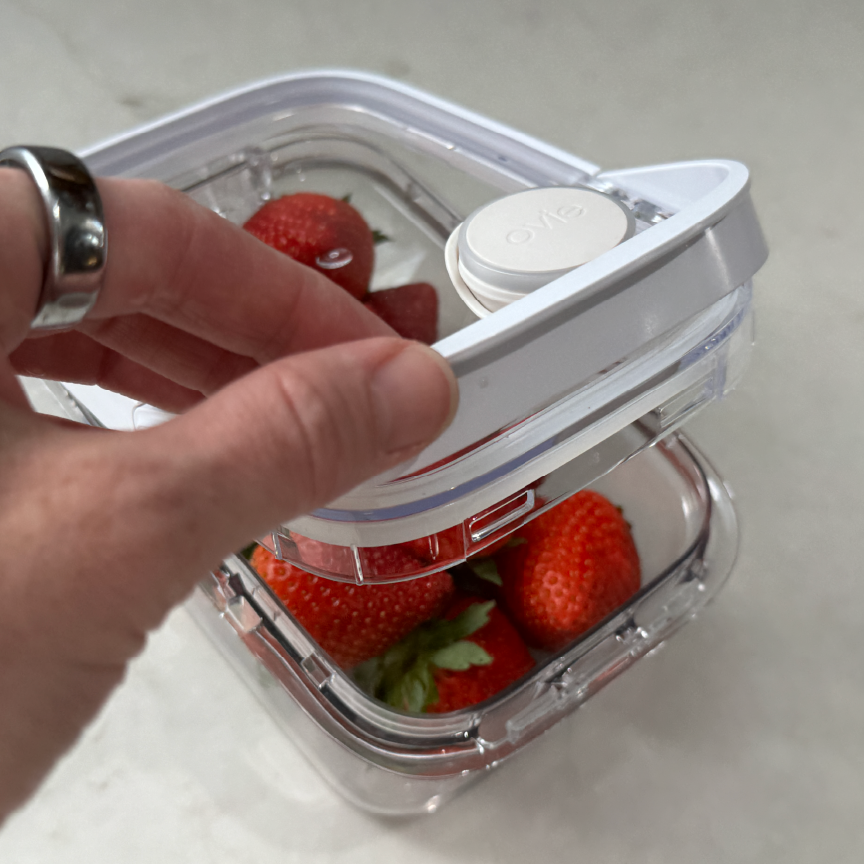 Container fully seals with one-hand operation to keep air out and freshness in.